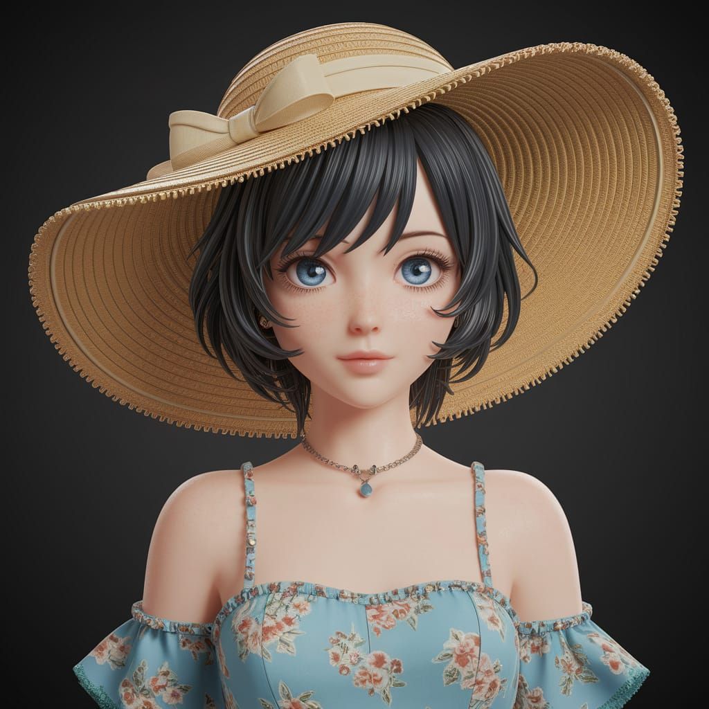 A full body portrait of Mayuri Shiina in a blue summer dress and sun hat. This anime art is highly detailed, with expressive eyes and an aesthetic inspired by 3D renderings.