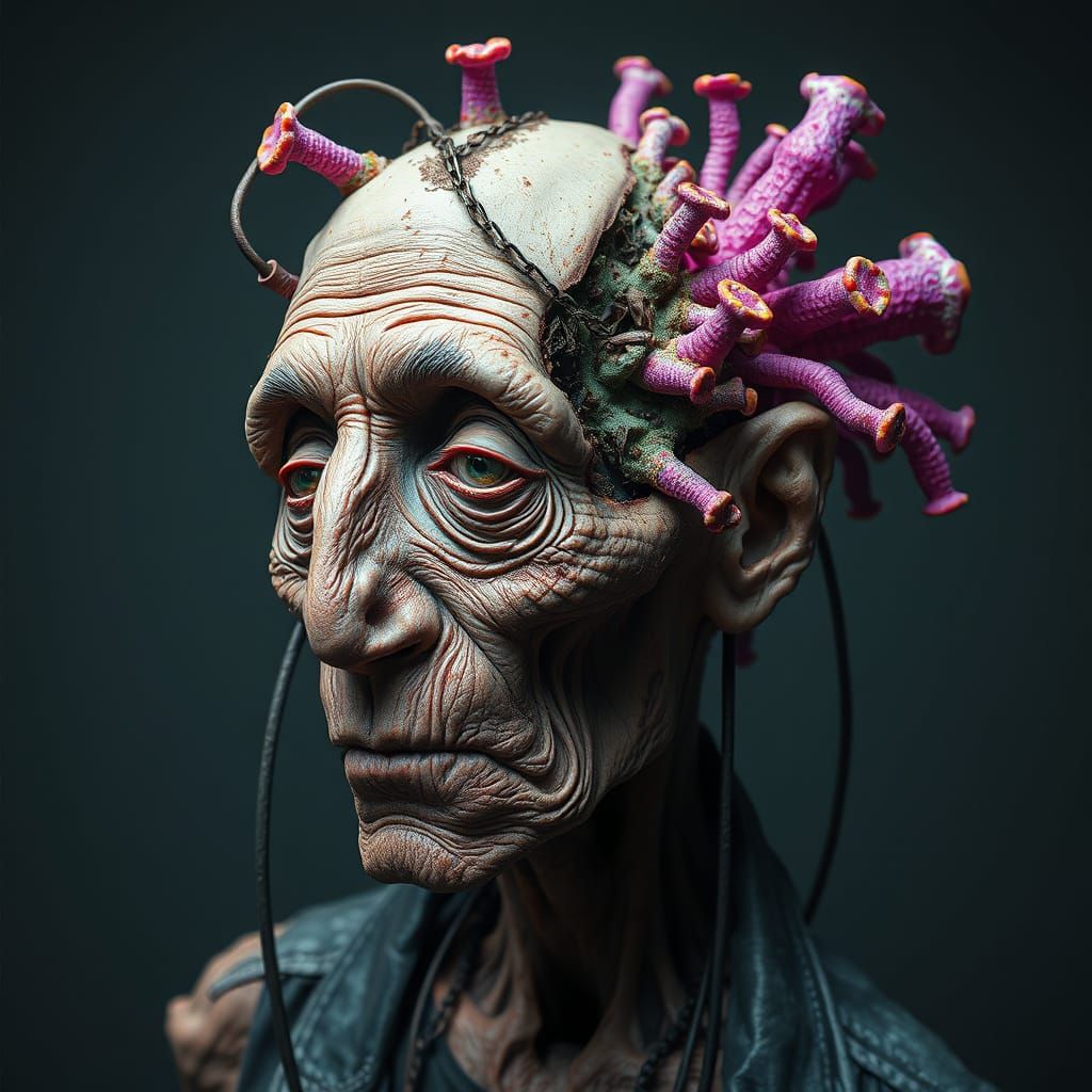 A surreal image of an elderly man's head, half decayed with exposed cables, the other half transforming into vibrant fungal growth in a biomechanical aesthetic.