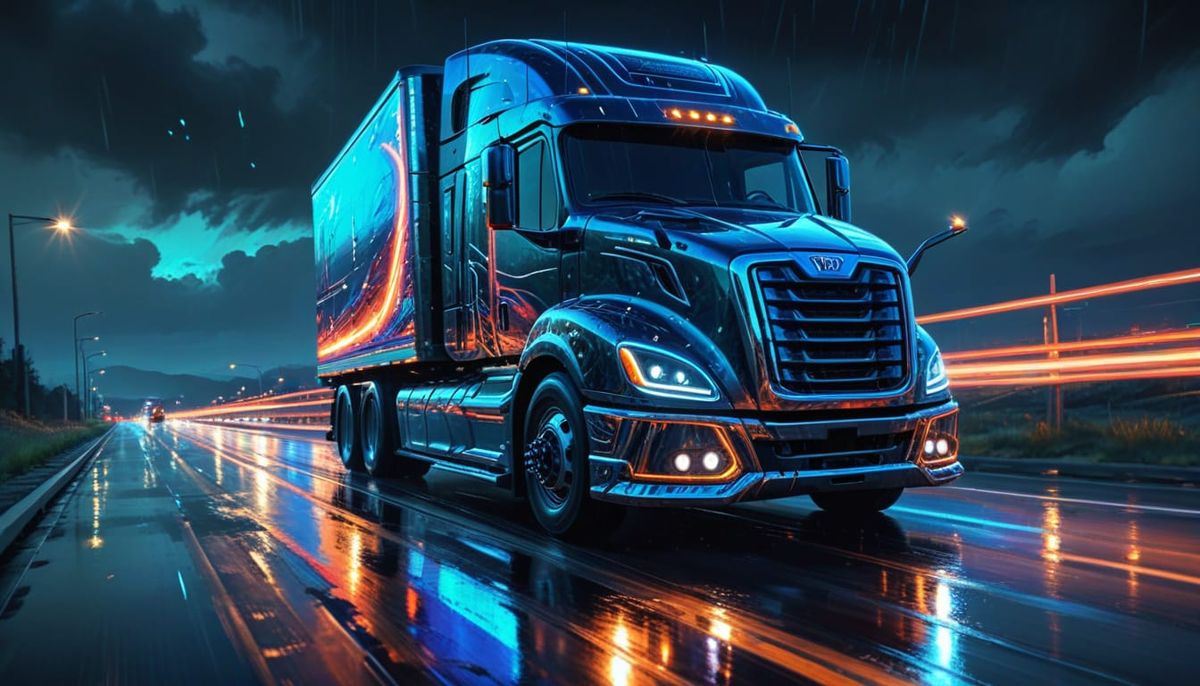 This image showcases a futuristic truck speeding down a highway, rendered as a digital painting with vibrant brushstrokes. The artwork features glowing neon lights and high contrast colors.