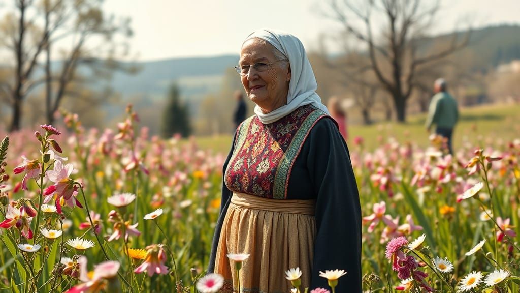 This image depicts a kind elderly woman in traditional Bulgarian attire, surrounded by blooming flowers and warm sunlight, evoking the serenity and hope of Bulgarian folk art.