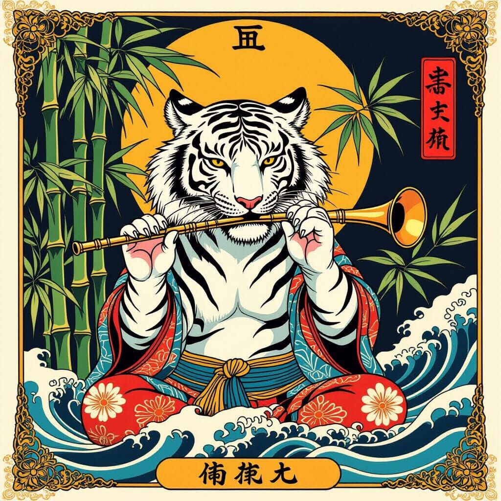 A striking picture of a white tiger in a bamboo forest, playing a flute trumpet with water fingers. The image embodies balance and is rendered in a traditional Japanese tattoo art style.