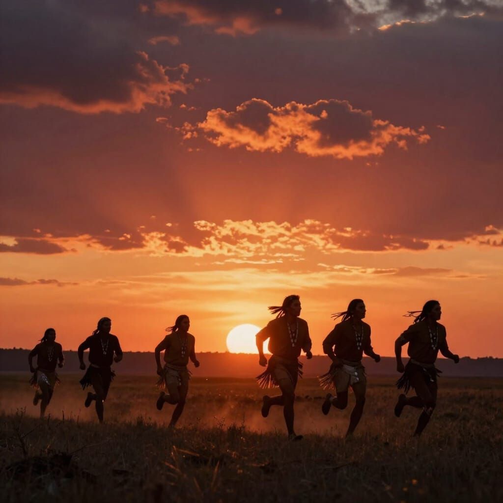 This image captures Native Americans running, silhouetted against a dramatic, fiery sunset. Rendered in an epic romantic style with vivid, saturated colors, it evokes awe-inspiring wilderness.