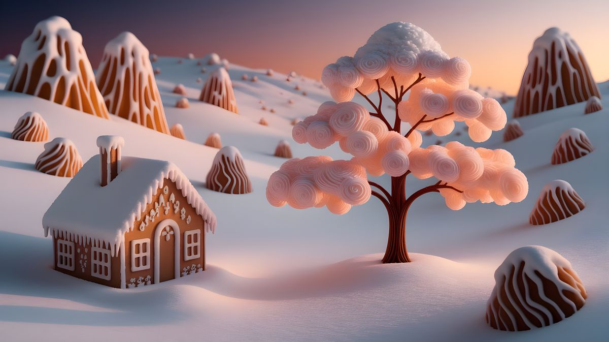 This image displays a dreamlike winter scene reimagined as a candy world, featuring a pine tree with sugar formations under warm sunset light. It's rendered with delicate detail and ethereal wonder.