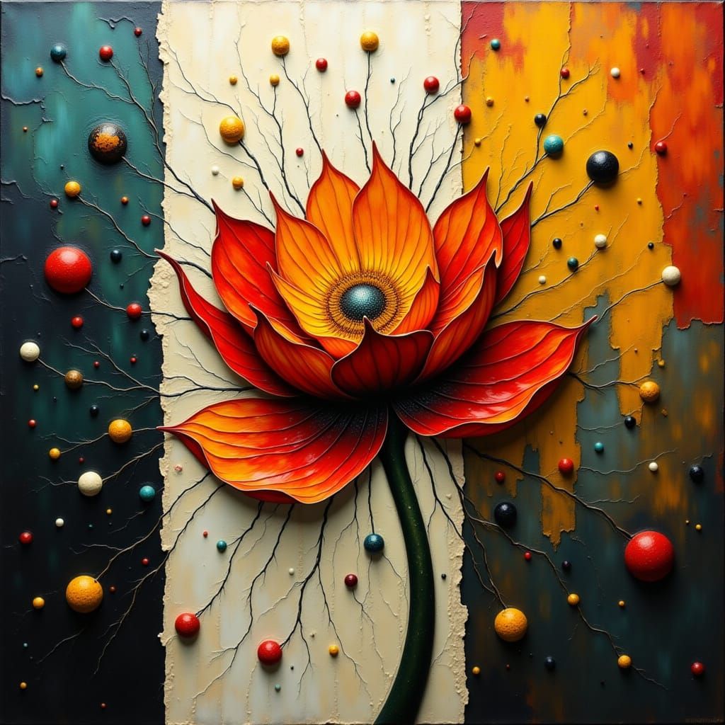 This image showcases a vibrant, stylized flower exploding with fiery colors in an abstract expressionist style. Rough, textured brushstrokes and radiating lines create a dynamic composition.