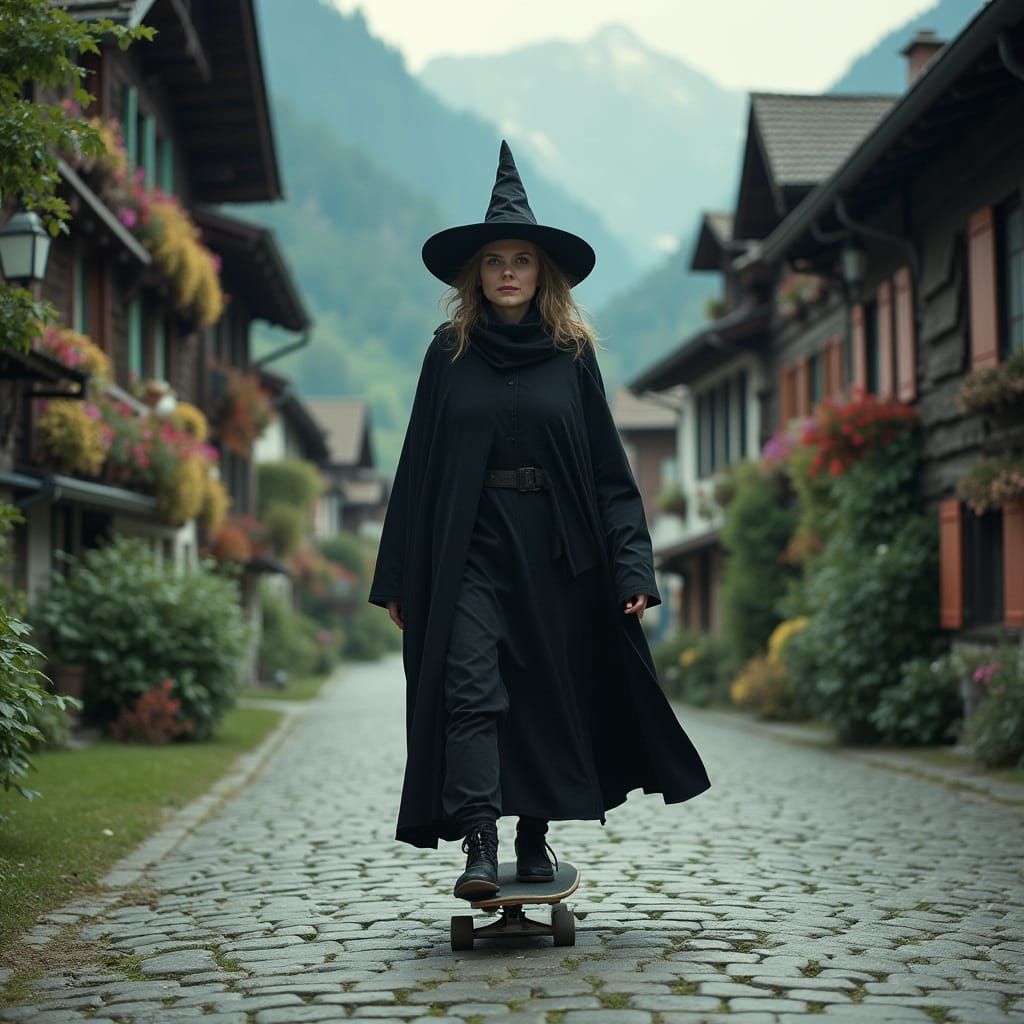 A photorealistic image of the Wicked Witch of the West from The Wizard of Oz riding a skateboard down a cobblestone street lined with Swiss chalets, surrounded by lush mountains, in a style inspired by cinematic lighting and gritty textures