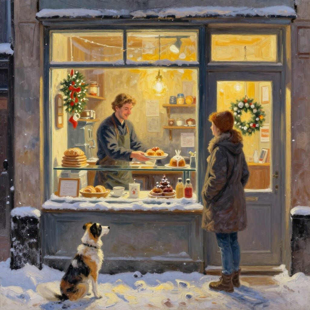 This image depicts a warm, inviting bakery scene on a snowy night. A baker serves a customer while a dog waits by the door, rendered in a detailed pastel and watercolor sketch style with thick gouache brushstrokes.