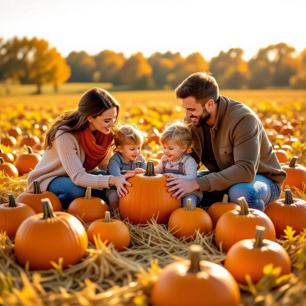 This photorealistic image captures a sunny autumn day in a pumpkin patch, with pumpkins scattered on straw under golden light. A family selects a pumpkin, showcasing vivid colors and incredible detail.