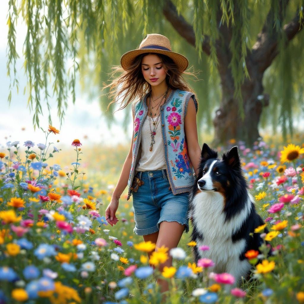 This image shows a bohemian teenage girl in denim shorts walking her dog through a wildflower meadow. The artwork has a dreamy, whimsical style with soft textures, reminiscent of classic fairy tale illustrations.