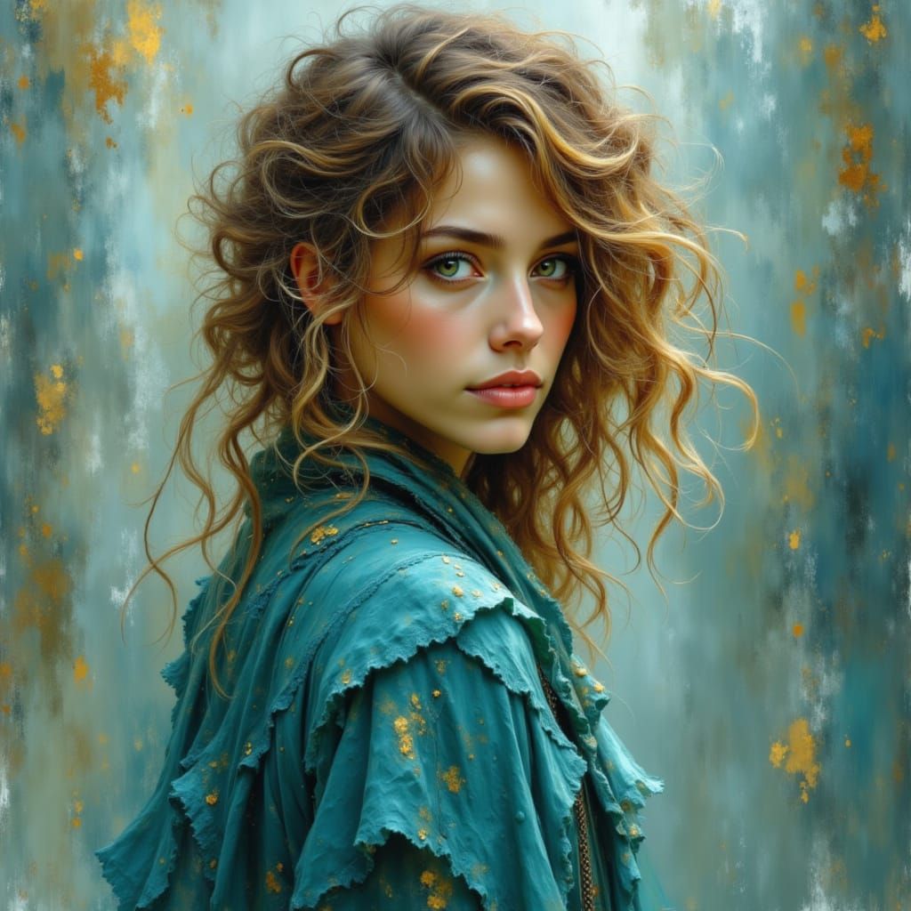 A captivating image of a mystic woman with flowing brown hair, glancing back over her shoulder. She wears a wolf-inspired gown in turquoise and teal, set against a soft background with volumetric lighting and post-impressionist style.