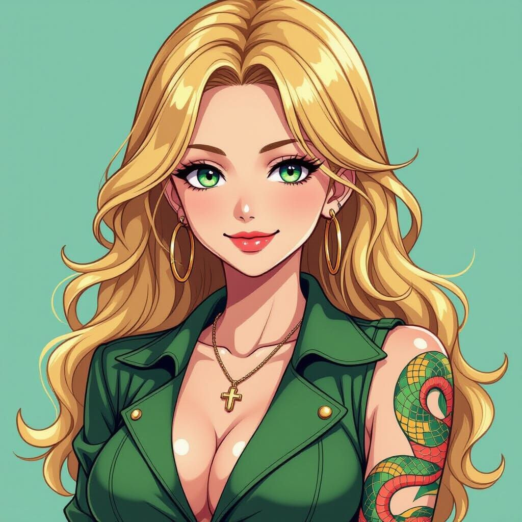 This anime-style illustration features a woman with blonde hair, green eyes, and a smirk, dressed in vintage men's attire. A snake tattoo adorns her arm in vibrant manga art.