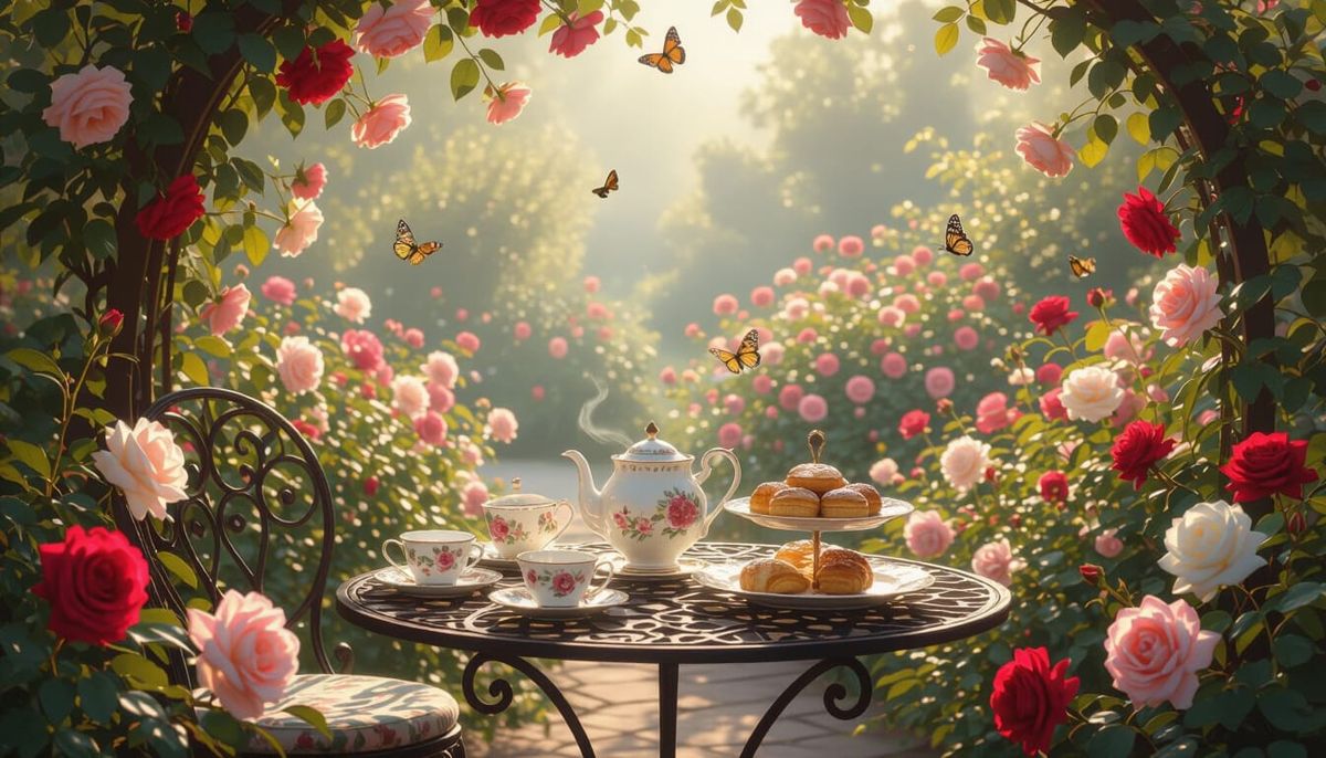 This image depicts a tranquil rose garden at dawn, featuring dew-kissed crimson, blush, and ivory petals. A vintage tea table is set for two, with butterflies flitting among the blooms, rendered in a romantic impressionist style with luminous colors and dappled light.