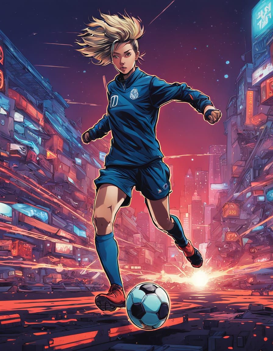 A dynamic manga image of a female soccer player in a futuristic USA uniform. Holographic ads reflect off the uniform, illuminated by golden hour lighting in a cyberpunk aesthetic.