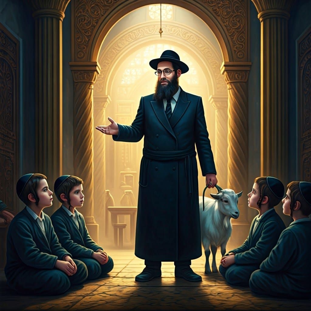 This image depicts a rabbi in a traditional synagogue setting, surrounded by children and a goat, as he passionately teaches the Passover sacrifice ritual in a dreamlike, symbolic style reminiscent of Chagall and medieval illuminated manuscripts.
