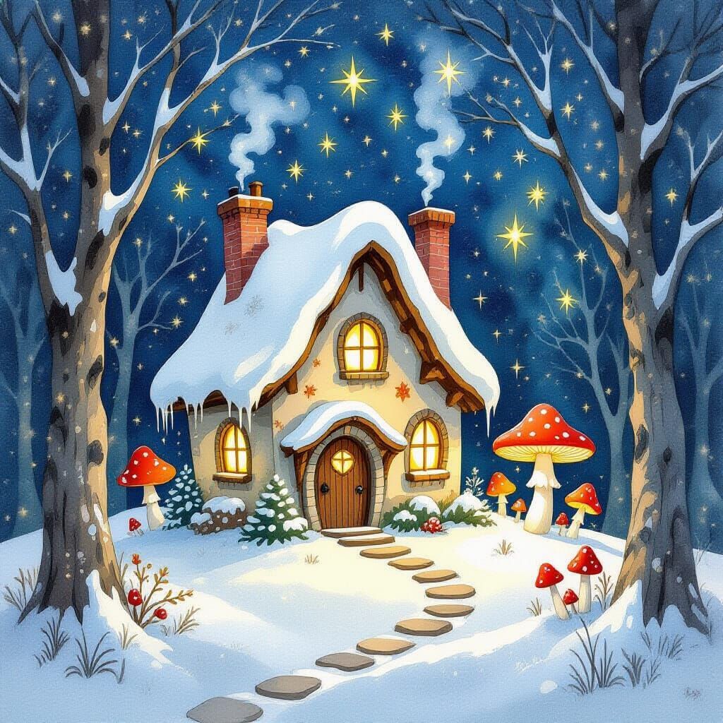 This image shows a whimsical fairy house in a snowy, festive forest with trees, stars, and mushrooms, created in a loose watercolor style with bleeding colors and visible brushstrokes.