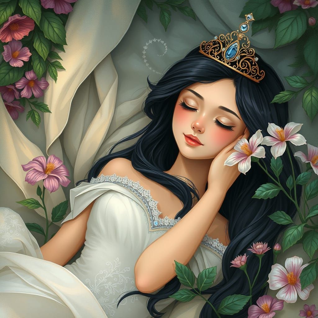 This image shows a princess in a serene, dreamlike setting, surrounded by lush greenery, vibrant flowers, and soft drapery, with a bejeweled tiara and a subtle, enigmatic smile, evoking a sense of ethereal wonder and fairytale magic, in a blended traditional and digital art style with muted pastel colors...