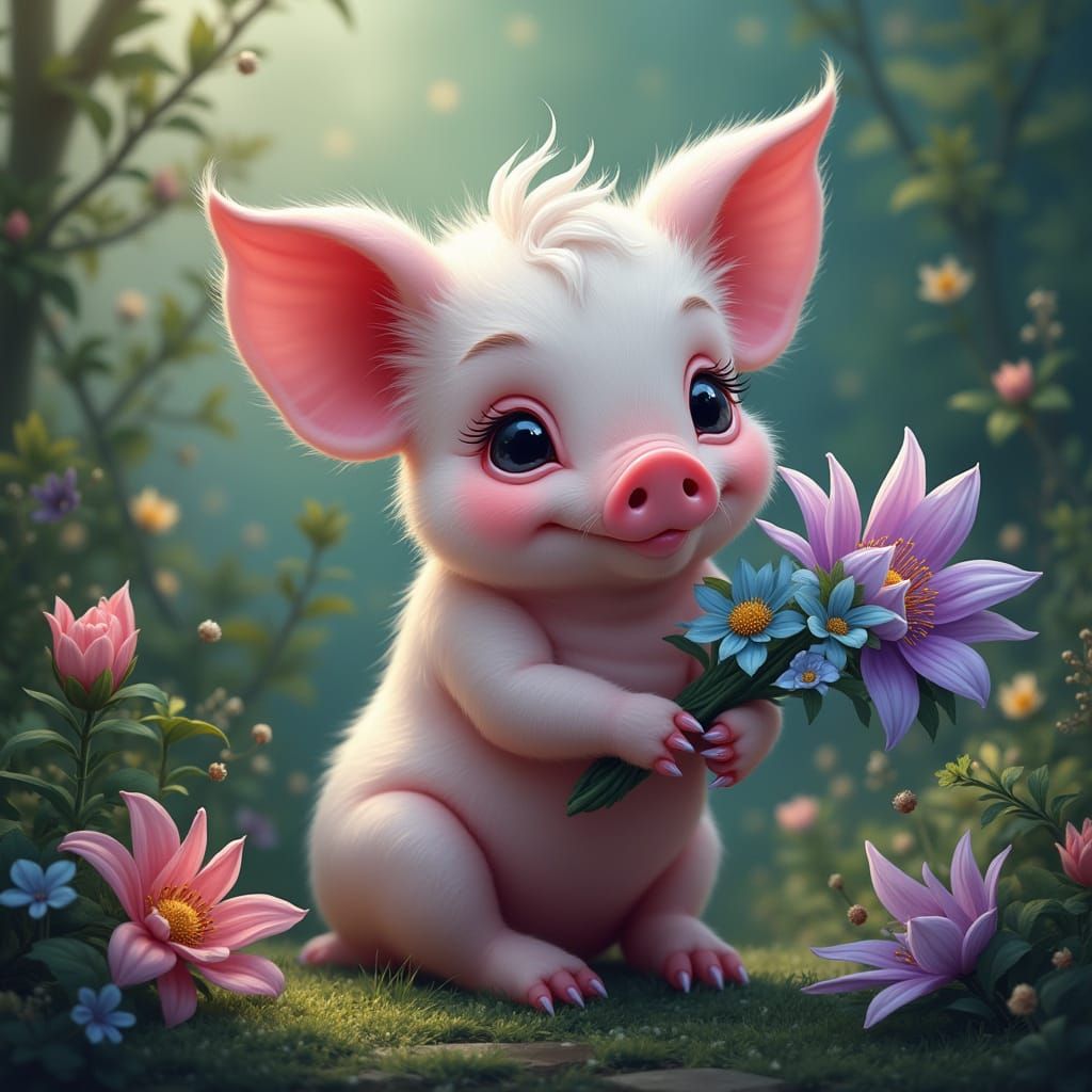 A charming image of a piglet with flowers in a magical garden. The artwork features soft textures and bold colors, with intricate patterns reminiscent of concept art. The aesthetic is fantasy art.