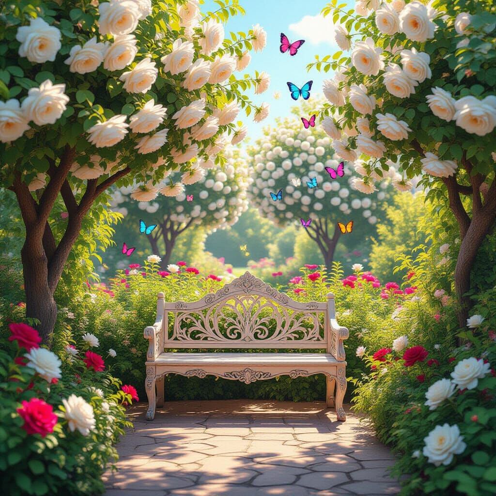 A hyperrealistic digital painting of a sunny garden filled with white rose trees. Vibrant neon butterflies create a living blanket over the scene, with a carved wooden bench. Features luminous colors and energetic composition.