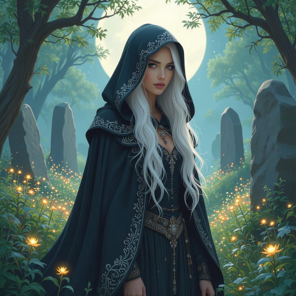 A captivating portrait of a sorceress in a hidden grove. The image blends Art Nouveau elegance with dark surrealism, featuring glowing flora and soft moonlight.