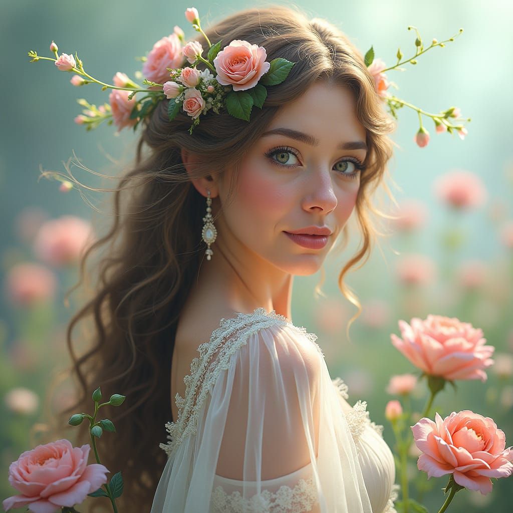A digital artwork of a European woman with flowers in her hair. Soft pastel colors and deep hues create depth, reminiscent of fantasy concept art and mystical realism. The image has a matte painting quality.