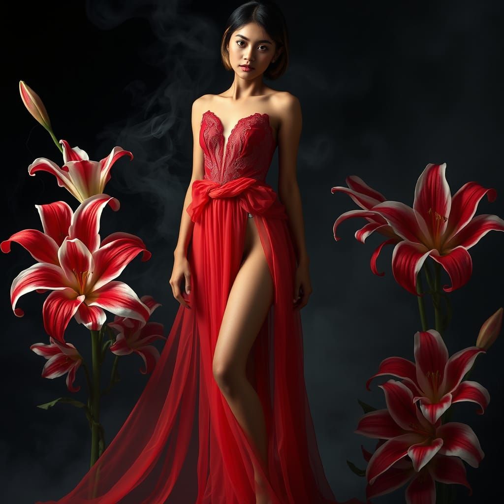 A striking picture of a slender Cambodian woman in a transparent crimson gown, posing gracefully amidst oversized lilies. The image features a dark, smoky background that enhances the ethereal quality and sensuality of the scene.