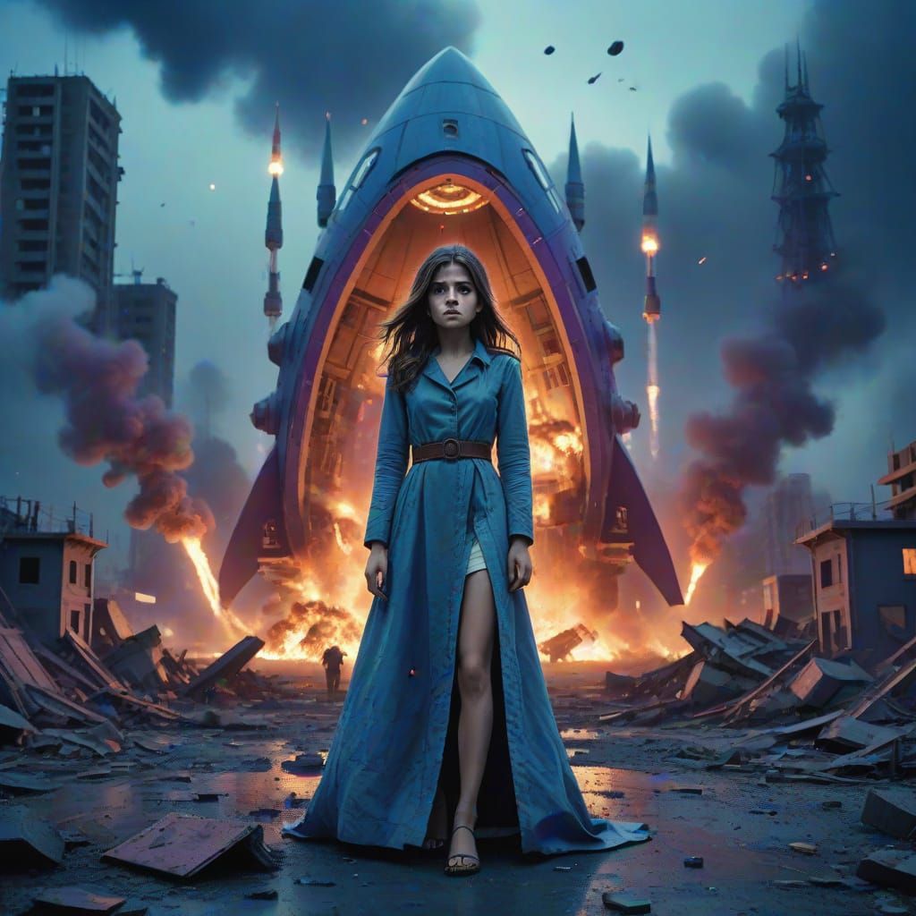 درباره دختری در فضا . دختری ایرانی با موی قهوه ای بلند و که خون گریه میکنه از چشمش خون و الماس میاد . پشت زمینه موشک در حال اتیش. ساختمانهای اتش گرفته است . خودش پاش روی ورودی یه سفینه فضایی هست . تم عکس ابی و بنفش باشه
