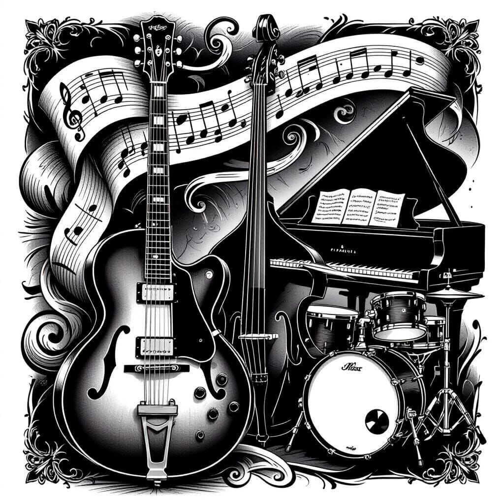 Design your own custom black and white jazz music tattoo ideas for free with our easy-to-use AI generator.