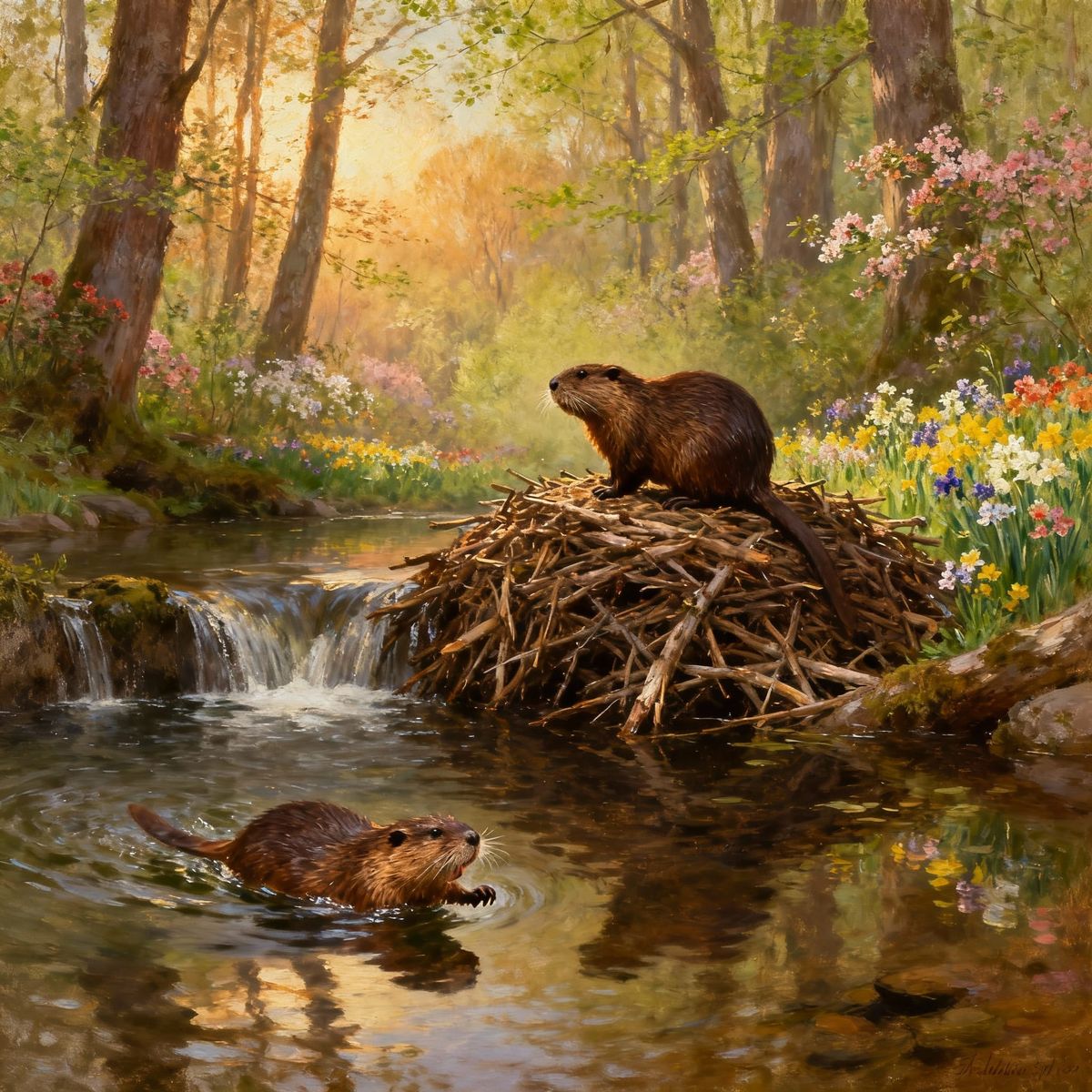 This image showcases beavers constructing a dam in a vibrant, flowery spring forest. Oil painting captures the scene with warm, naturalistic light and rich colors.