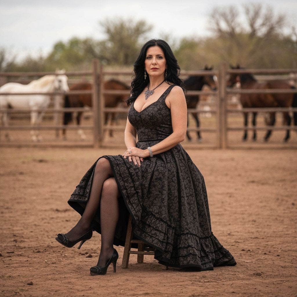 This image shows a beautiful Argentinian woman with raven hair in her early 40s, wearing a traditional dress, pantyhose, and heels, sitting on a stool. The background features an old Argentinian village with horses in a corral, captured with professional photography techniques.