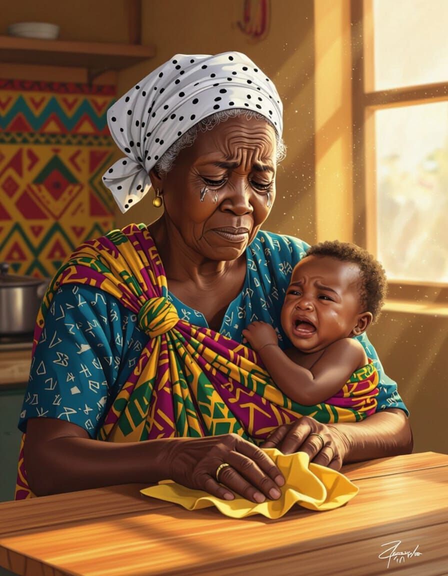 This ultra-detailed digital painting shows a dignified elderly African grandmother with silver hair, crying as she wipes a table. Her infant grandson is also crying, tied to her back. Warm sunlight illuminates the scene with African geometric motifs in the background.