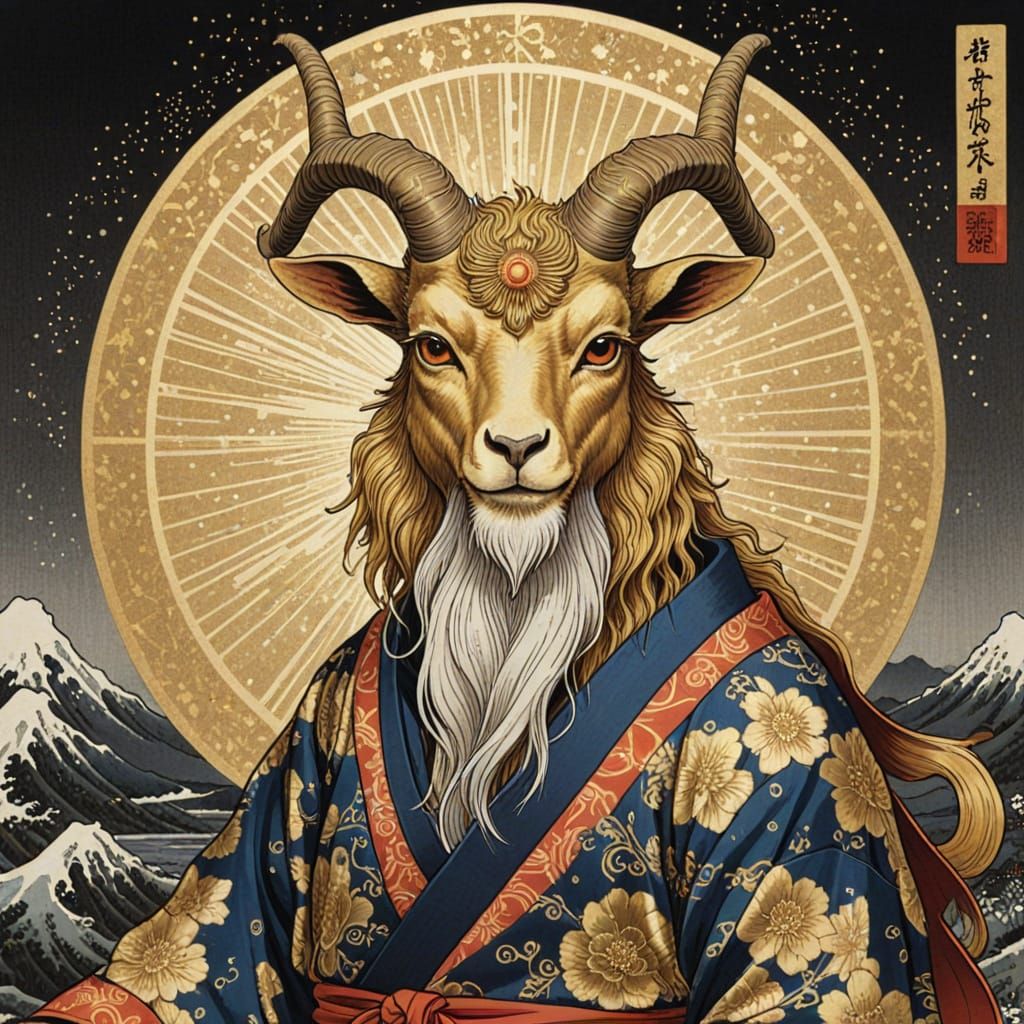 This image depicts a golden goat god in the style of a traditional Japanese ukiyo-e print. The artwork features a glittering aesthetic.