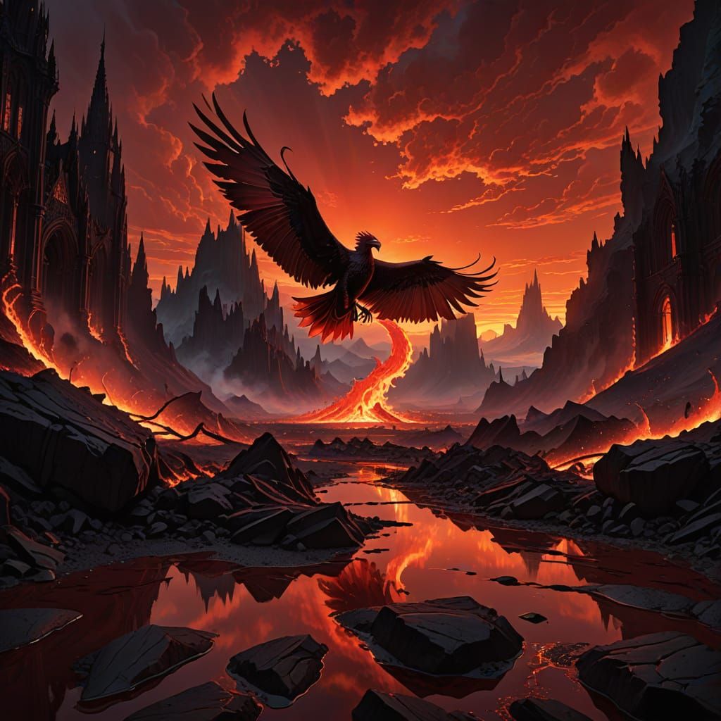 This image shows a volcanic landscape beneath a fiery sky. Molten lava flows through dark rocks, with a giant phoenix above a gothic cathedral carved into the volcano. Ash drifts in the air, in a fantasy art style.