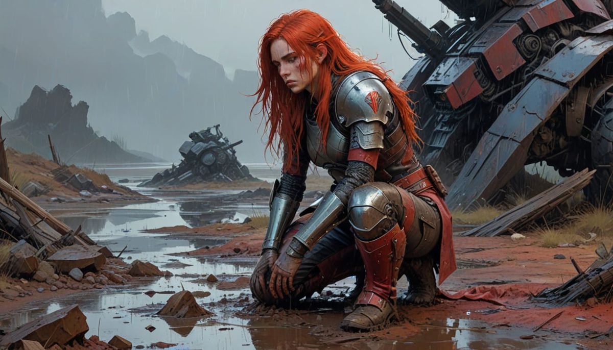 A gritty watercolor and ink image of a battle-worn woman with long red hair, kneeling in a harsh, rainy environment. She wears tattered leather and metal armor in a dark fantasy style.