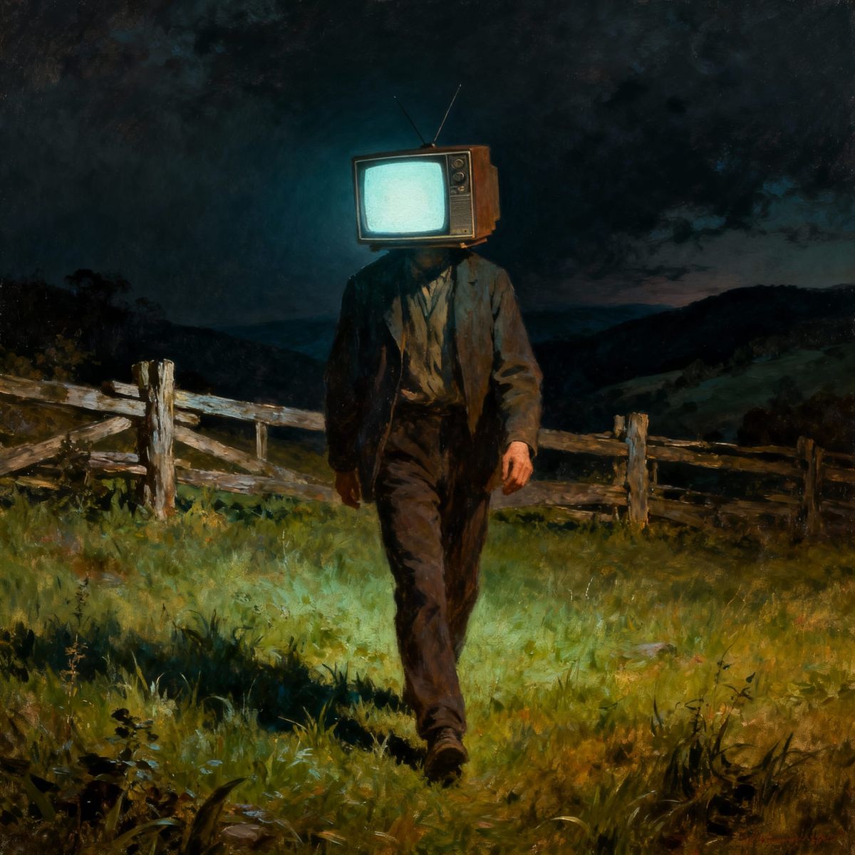 This image shows a surreal oil painting of a man with a vintage television on his head walking through a dark, rural landscape. Rendered with dramatic lighting and textured brushwork for a mysterious atmosphere.