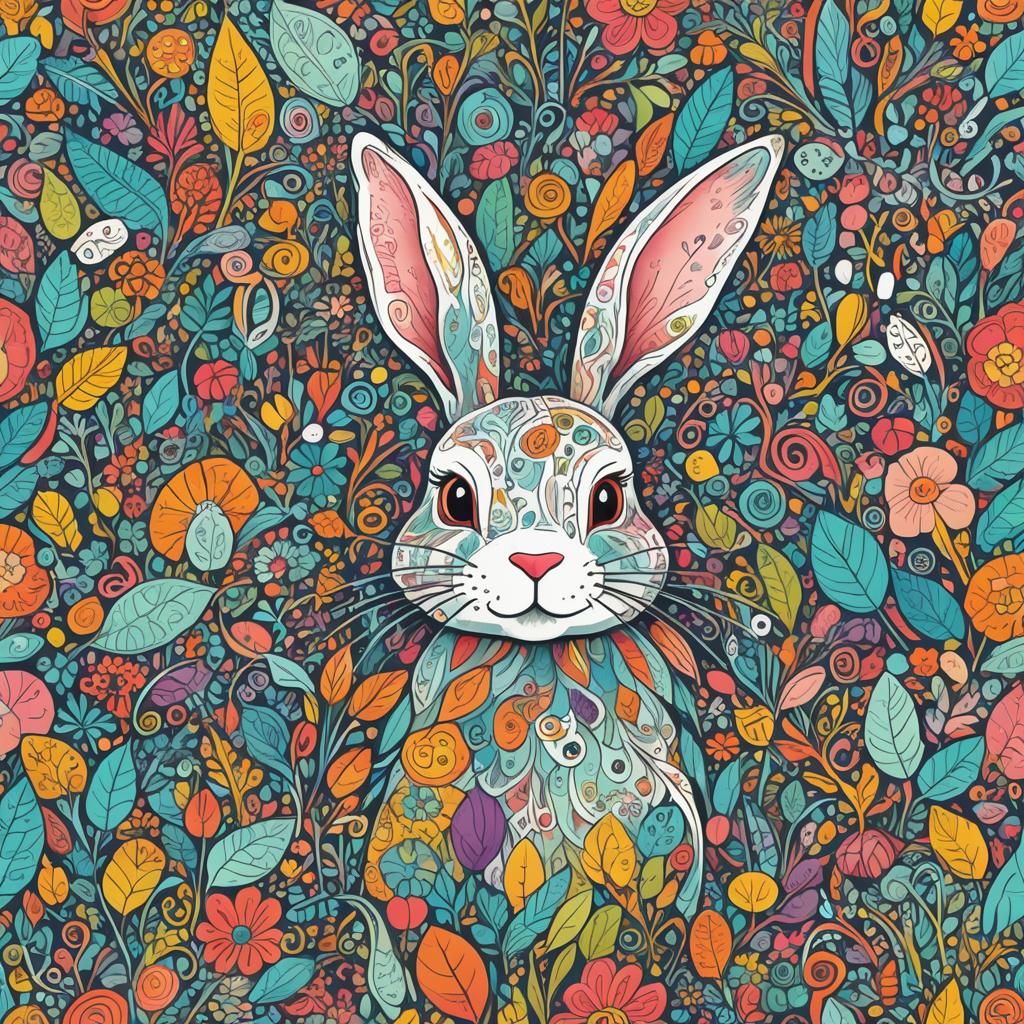 This image shows a whimsical illustration of a playful rabbit surrounded by colorful doodles. The artwork features bright lines, soft lighting, and vibrant pastel colors, reminiscent of children's book art.
