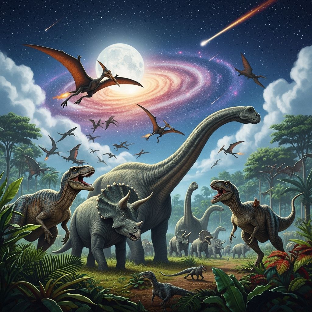 A vibrant image of dinosaurs in their natural habitat. Herbivores roam as carnivores stalk, with flying reptiles overhead. A meteor streaks across the sky, all under a vibrant moon in a digital painting style.
