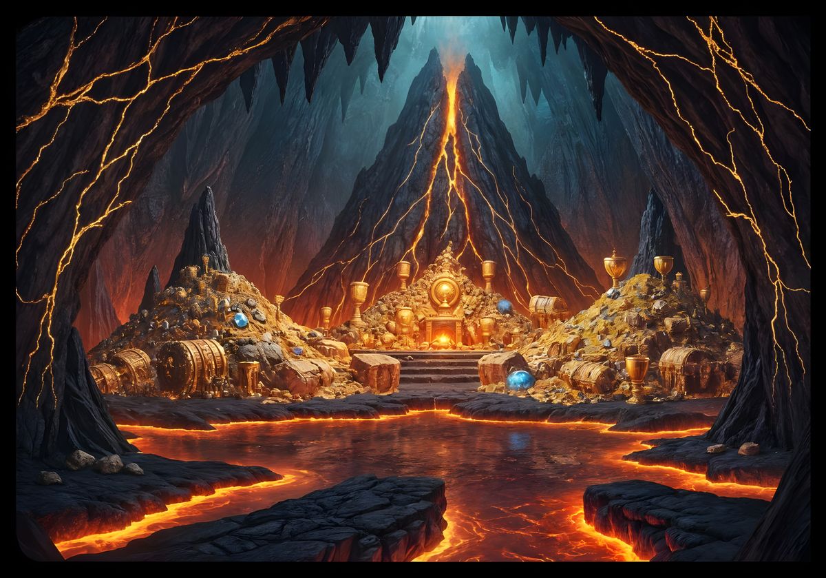 an enormous cavern beneath an active volcano. The walls are obsidian with veins of gold running through them. Inside the cavern is a huge pile of golden treasure, chalices, coins, jewels. surrounded by a moat of lava. detailed matte painting, deep color, fantastical, intricate detail, splash screen, ...
