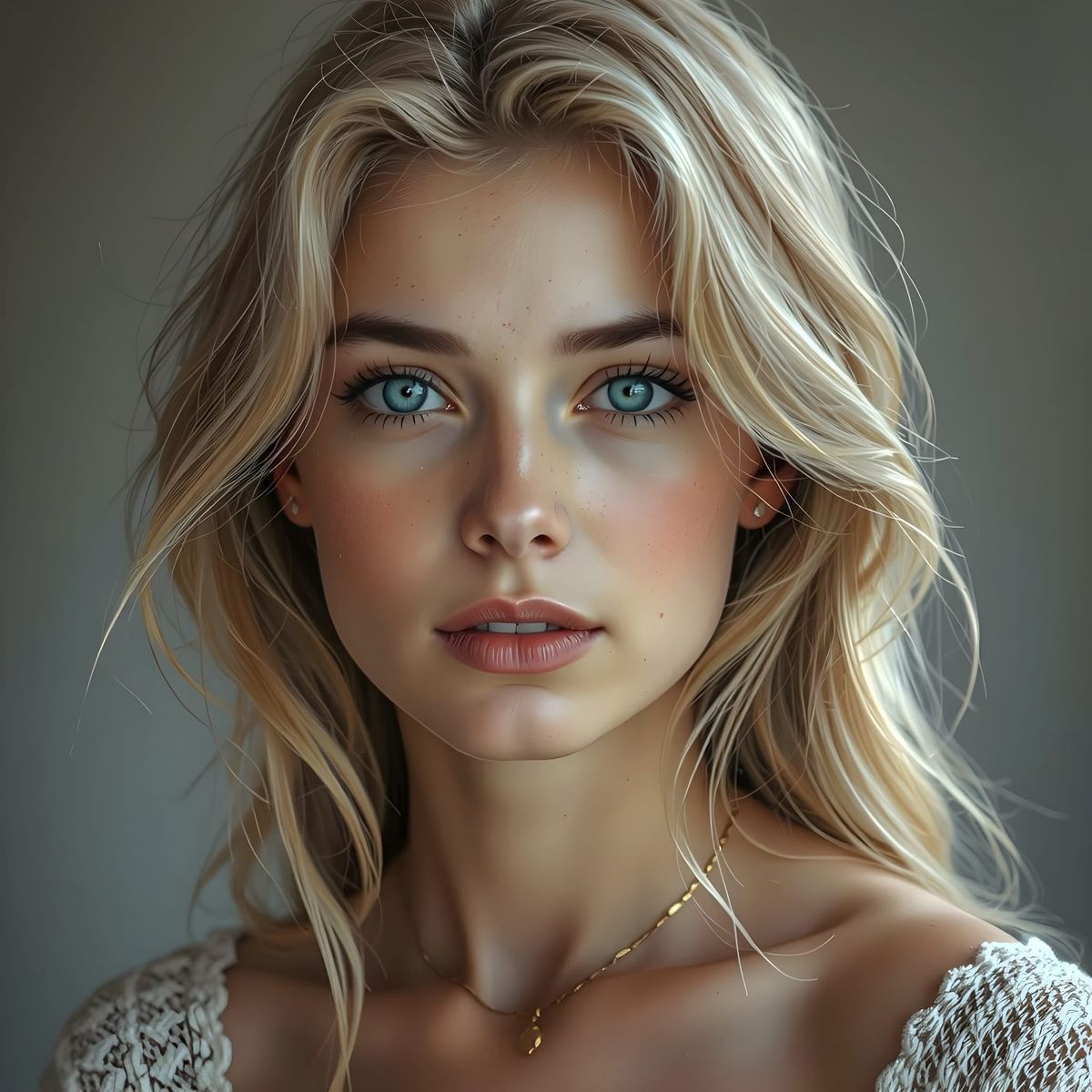 This image shows a fair-skinned blonde woman with blue eyes in a natural setting. The portrait features soft lighting and a shallow depth of field, reminiscent of fine art photography.