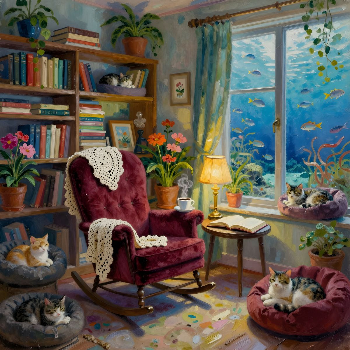 This image features a richly detailed room with books, plants, cats, and a rocking chair. Large windows reveal a vibrant underwater world with fish swimming by, rendered in a thick, textured gouache and watercolor style.