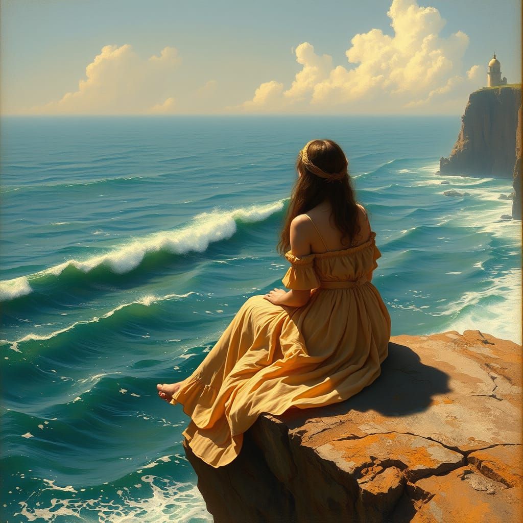 This serene image depicts a woman sitting on a cliff, lost in thought as she gazes out at a peaceful ocean scene. Warm, golden lighting and intricate details evoke a sense of tranquility, reminiscent of 19th-century Russian landscape art.
