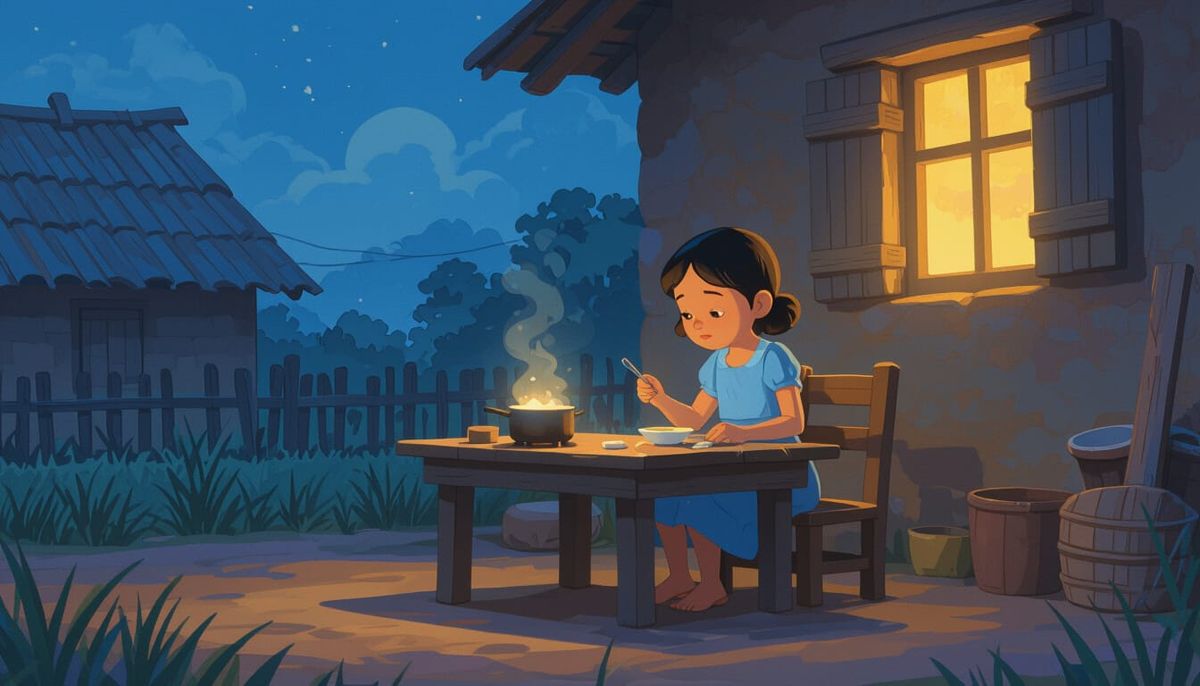 This image shows a young girl named Salma cooking and eating alone inside a rustic home at night. The scene is rendered in a 3D Pixar cartoon style with warm lighting and vibrant colors.