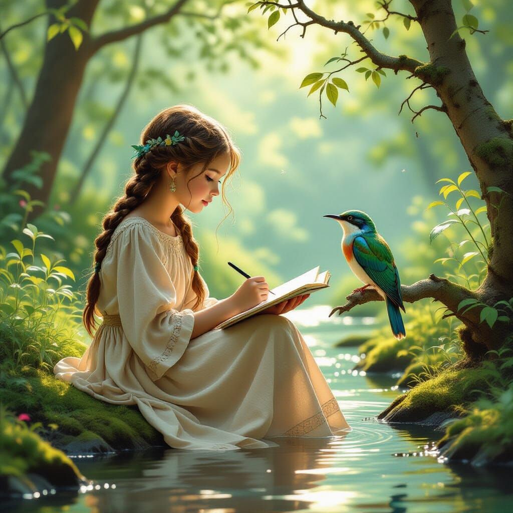 This image shows a girl with braided hair sketching a bird by a stream. The illustration blends Art Nouveau's organic forms with detailed elements reminiscent of classic fairytale art.