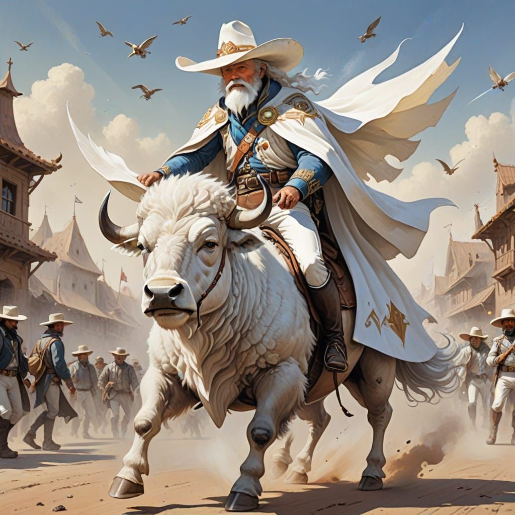 This image shows a whimsical caricature of a white-bearded man in a flowing cape and sombrero riding a futuristic white buffalo, rendered in a fantastical style.