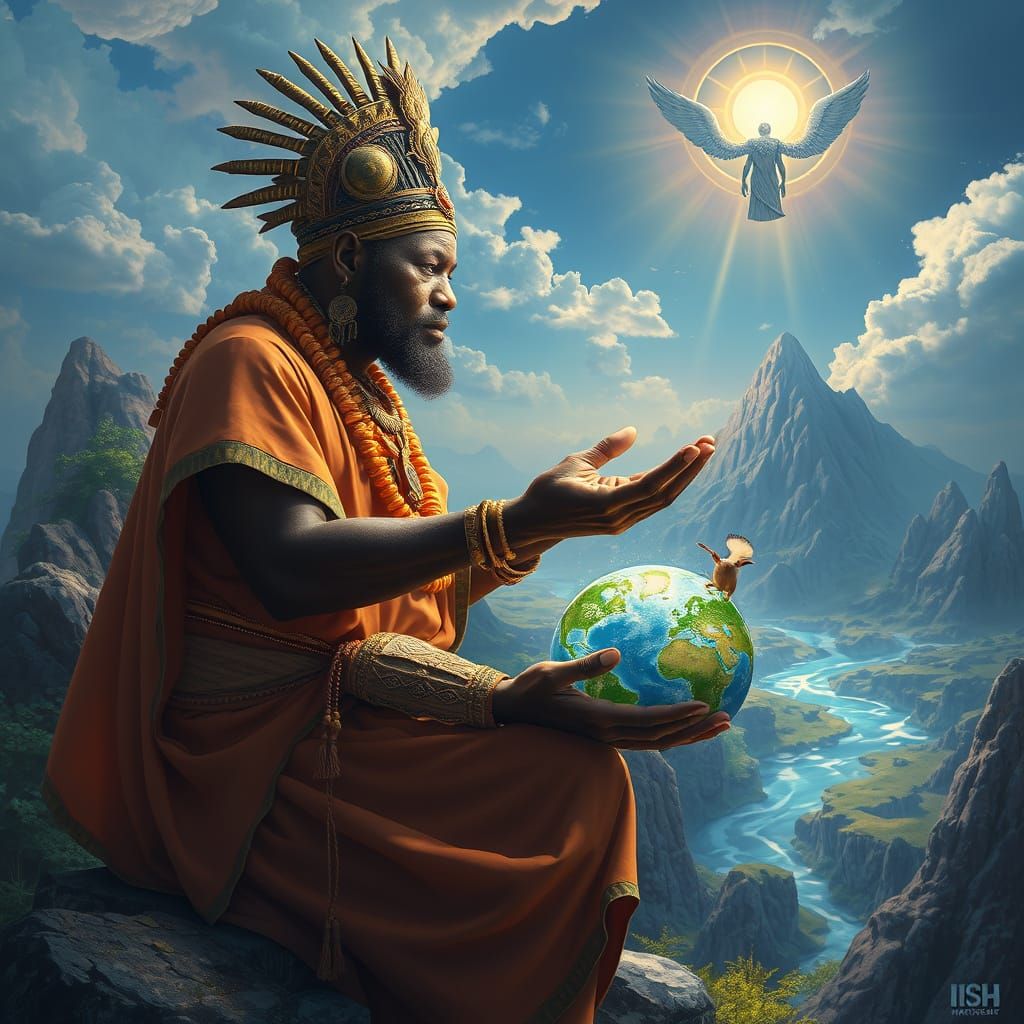 This image shows Orunmila, in Yoruba clothing, creating the Earth. Rivers, mountains, and animals materialize from his hands in a vibrant scene as Olodumare watches from above in a luminescent digital art style.