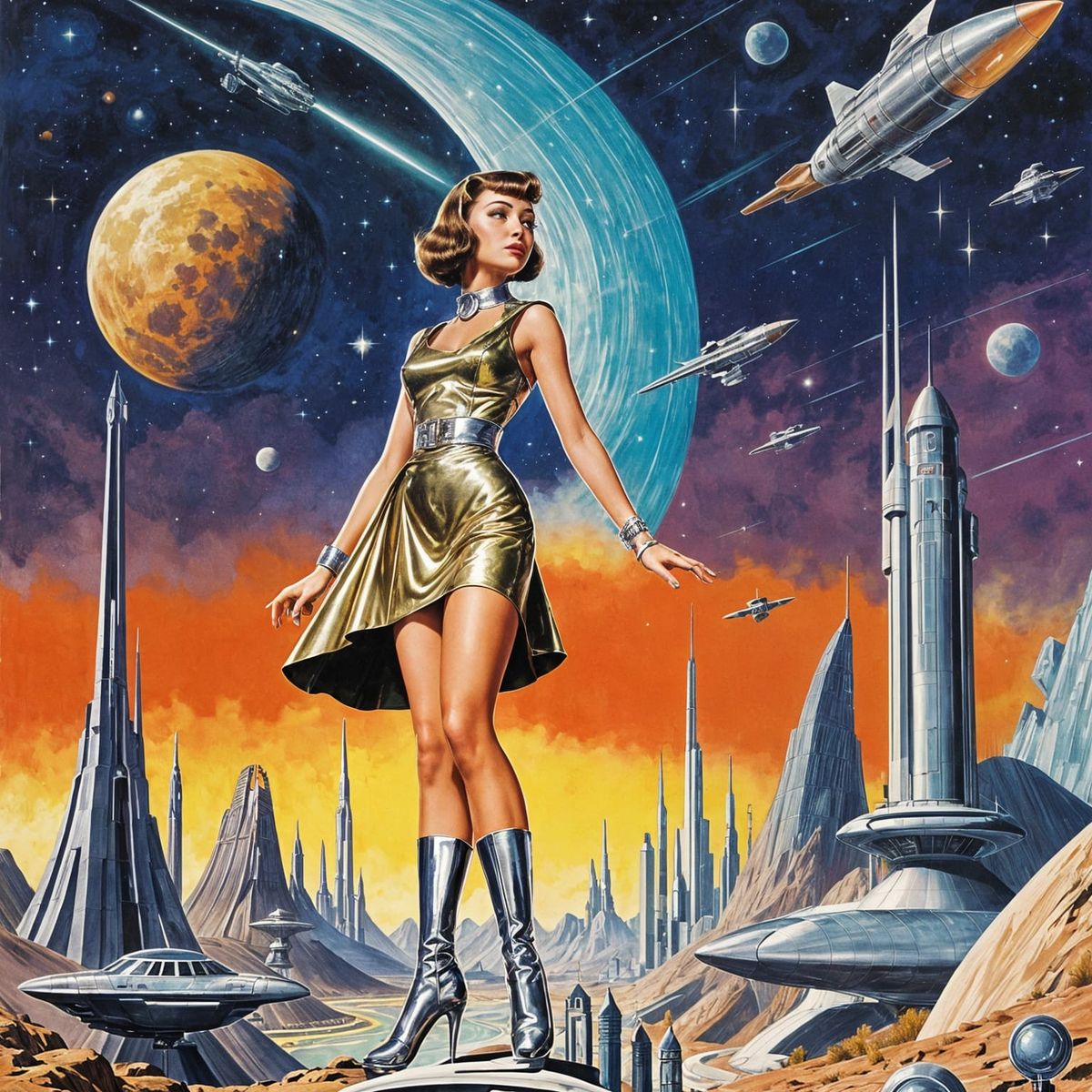 This image depicts Loxy Isadora Bliss on a retro-futuristic 1950s pulp magazine cover. Features include a metallic mini-dress, rocket ships, and alien cities in a neon sky. Style of classic pulp art.