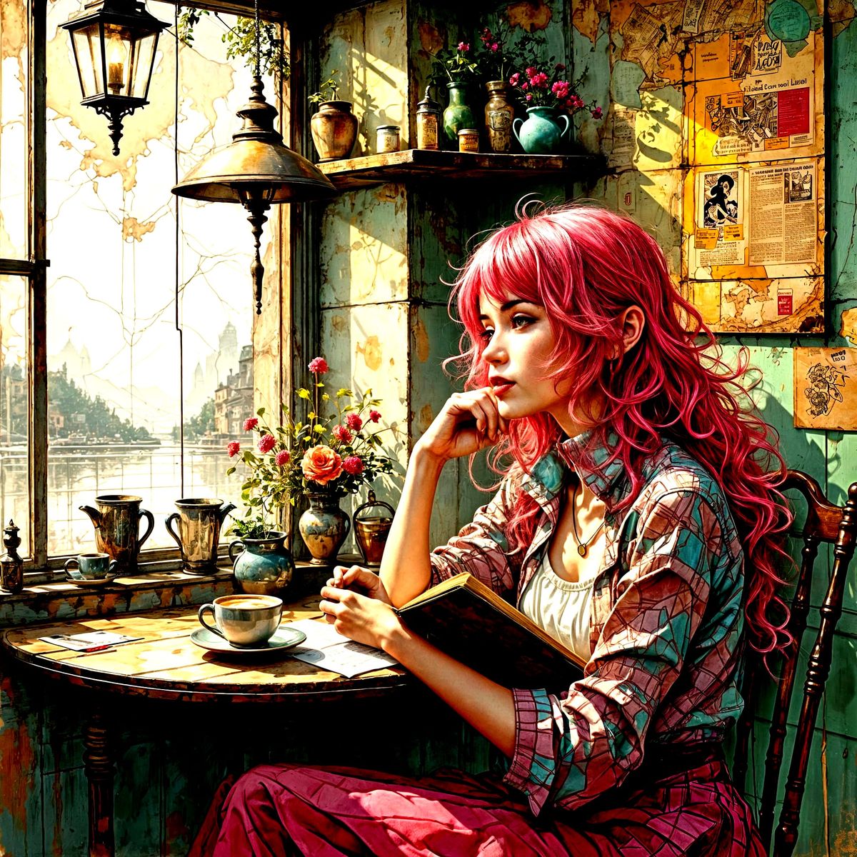 <lora:Ink Poet:1.0> <lora:Akimora:1.0> A young woman with bright pink hair sits in a cozy cafe, sipping a latte and reading a book. Sunlight streams through the window, illuminating the dust motes dancing in the air. The cafe is decorated with vintage posters and quirky artwork. The style is reminiscent ...