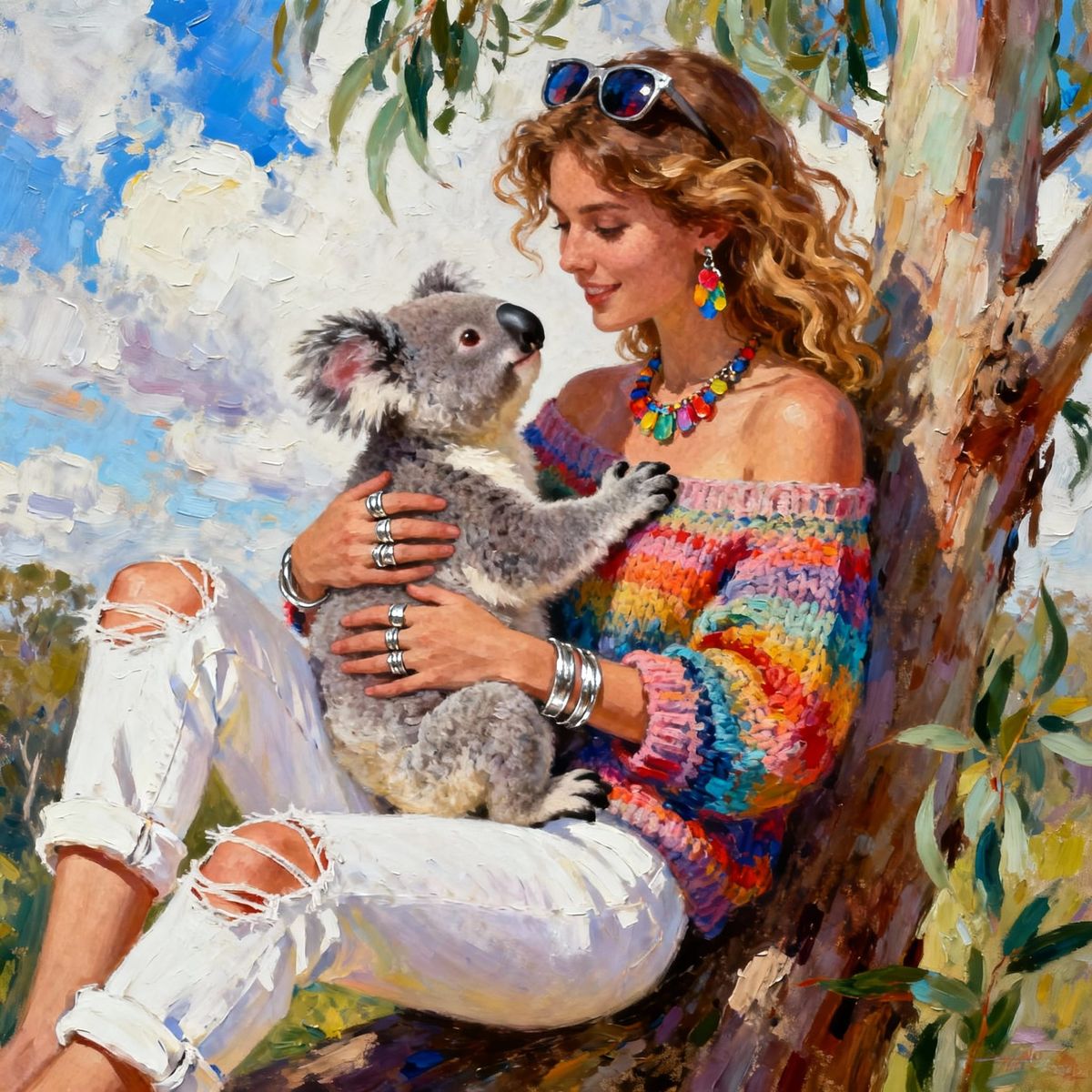 This image shows a woman in a colorful sweater and ripped pants holding a fluffy koala by a eucalyptus tree on a partly cloudy day. Rendered in an expressive, impasto oil and acrylic painting style with thick, textured paint.