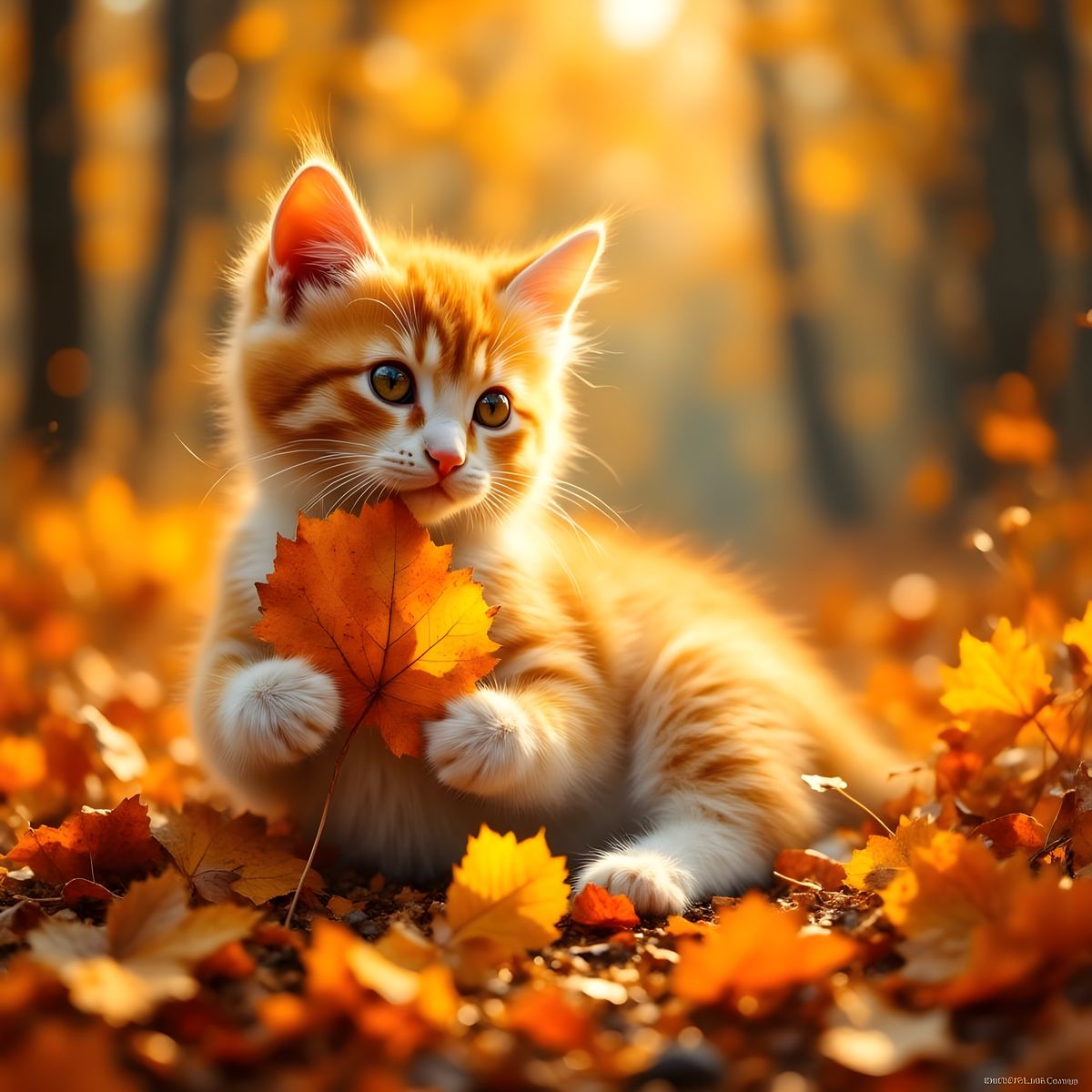 This image shows a cute orange tabby kitten nestled in a heap of colorful autumn leaves, holding one large leaf. The scene evokes a warm, cozy fall feeling with soft background light.