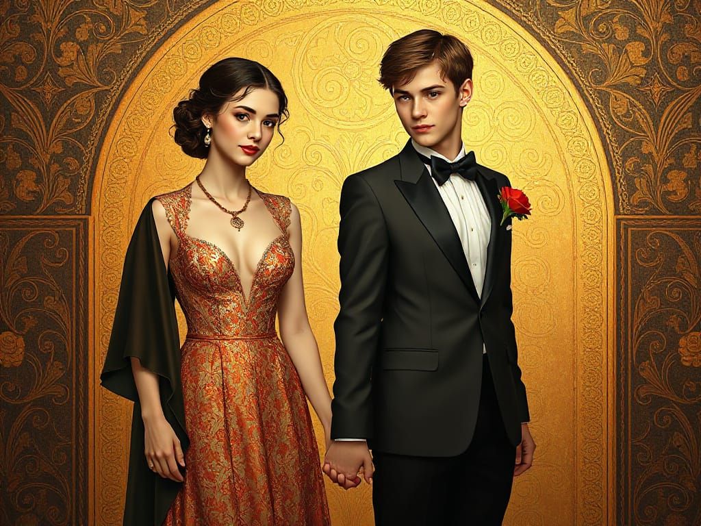 A striking picture of a young couple holding hands in an opulent golden setting. The image features intricate patterns and symbolism in an art nouveau style, reminiscent of early 20th-century painting.