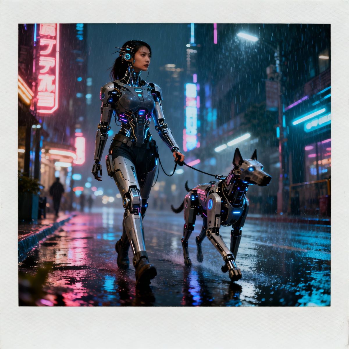 A cinematic photo of a cyborg woman and her robotic dog in a rainy, neon-lit futuristic city. Features a distinct film grain and moody lighting for an atmospheric feel.