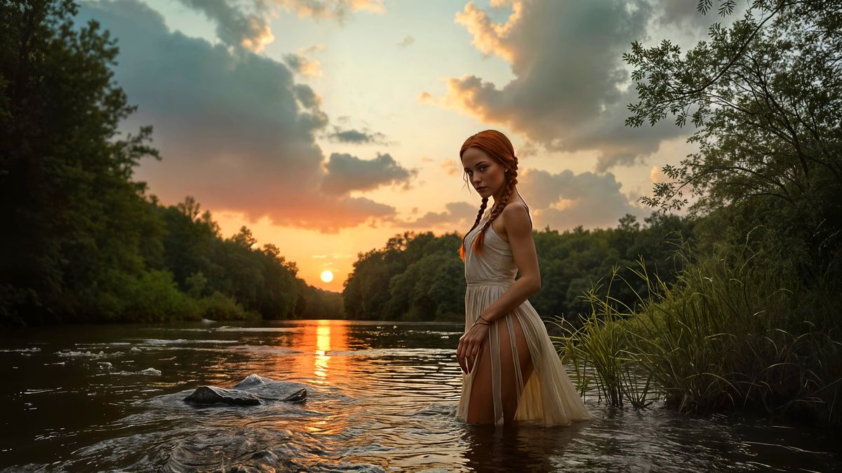 This image shows a woman standing in a river, surrounded by a lush green forest and vibrant sunset colors. Her long red hair and pale skin are intricately detailed, with a subtle, photorealistic style.